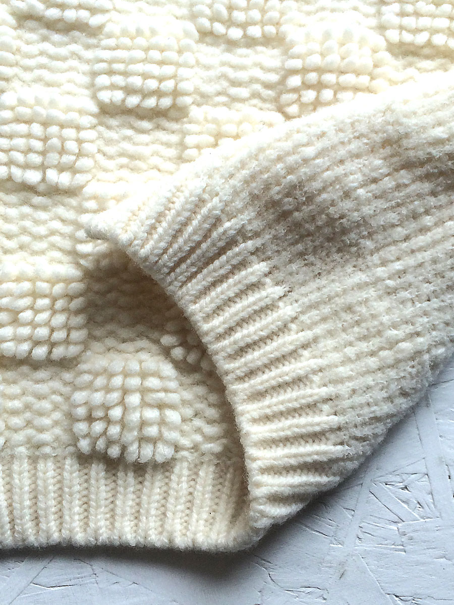 表面に出ている輪状の糸が特徴的なブークレヤーンと空気を含んだように軽いエアヤーン、2種類の毛糸を使用し、表編みと裏編みのみでチェッカー柄を表現。