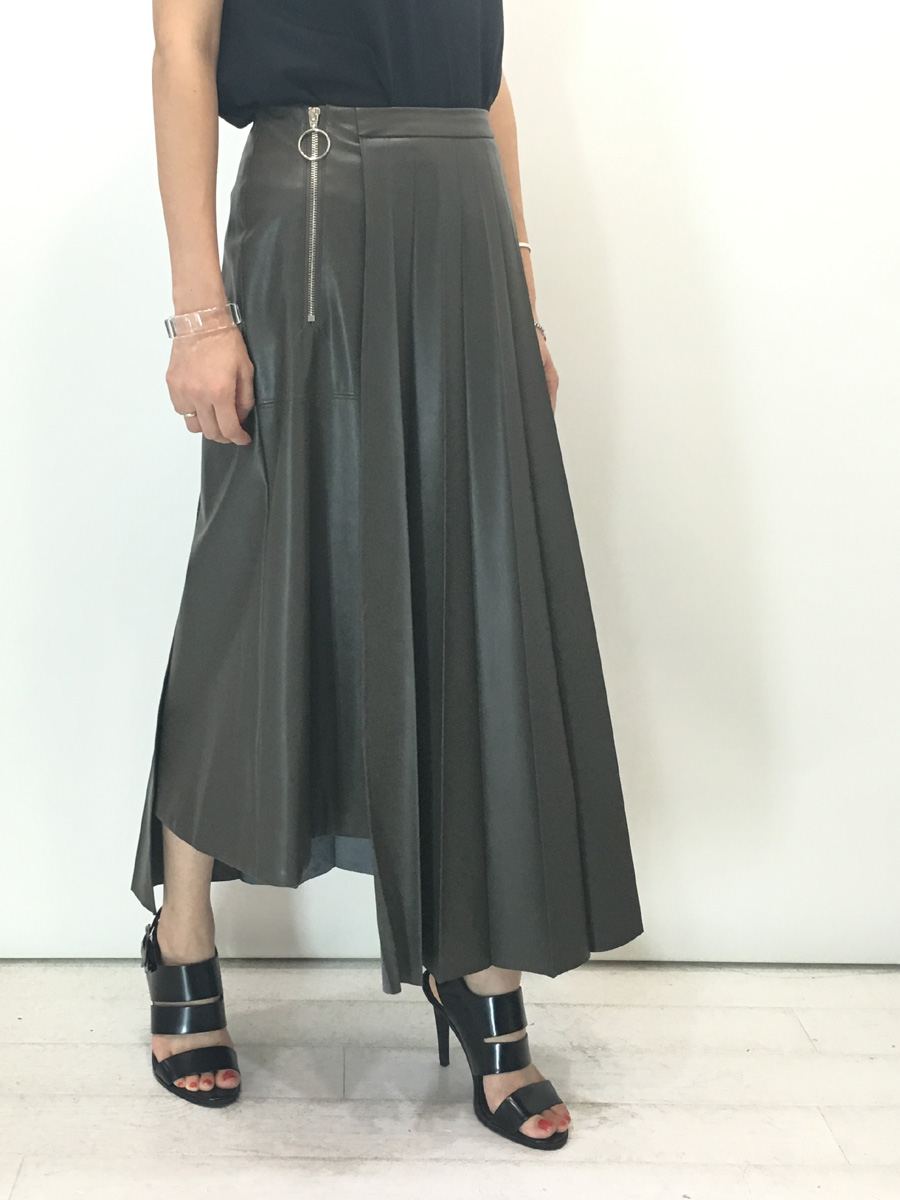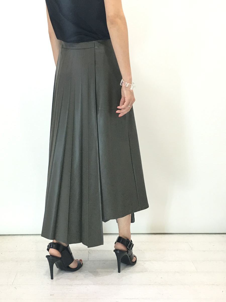 タイトスカートとロングプリーツスカートを組み合わせたアシンメトリーデザイン。 左右の丈に大きく差をつけることでアクセントにしています。
