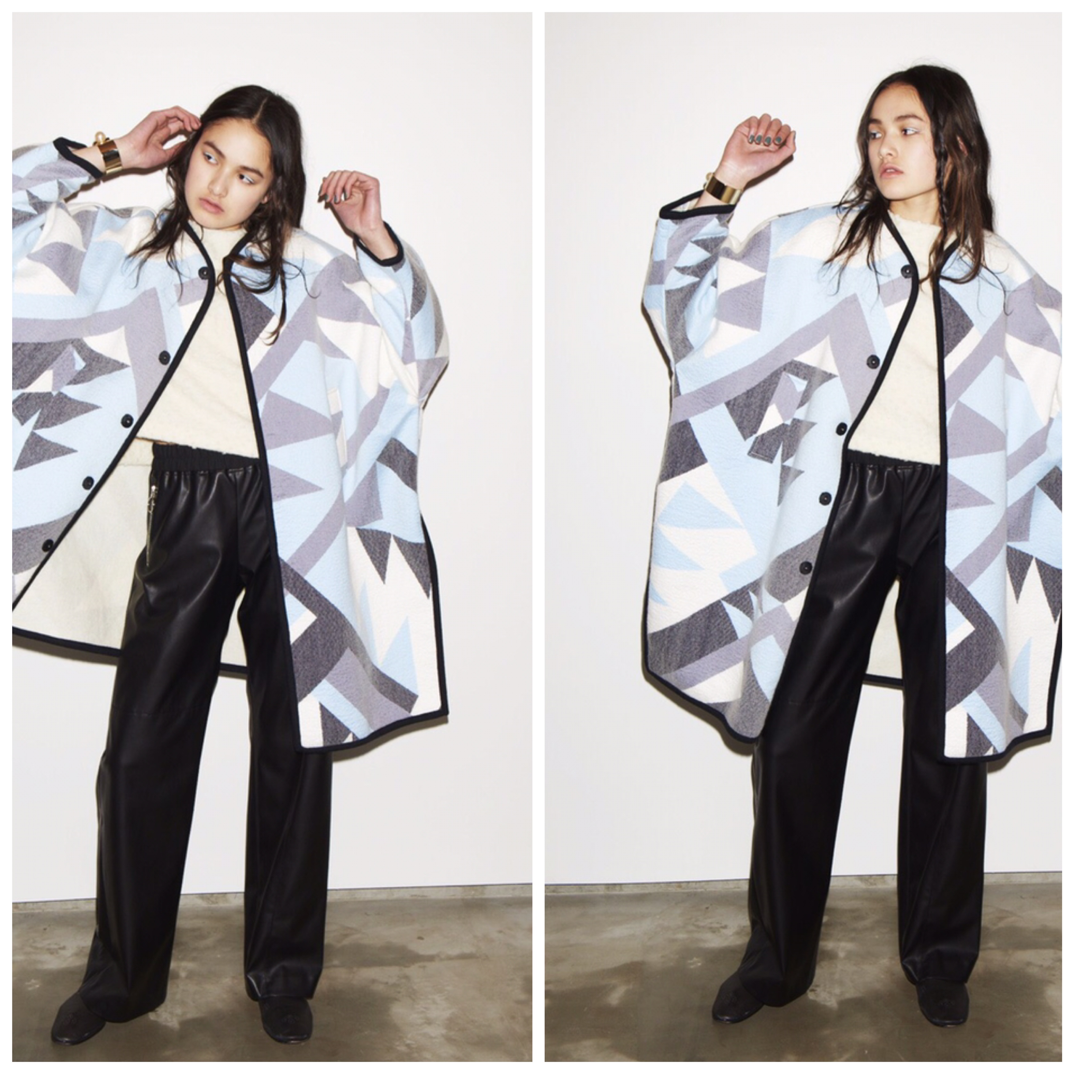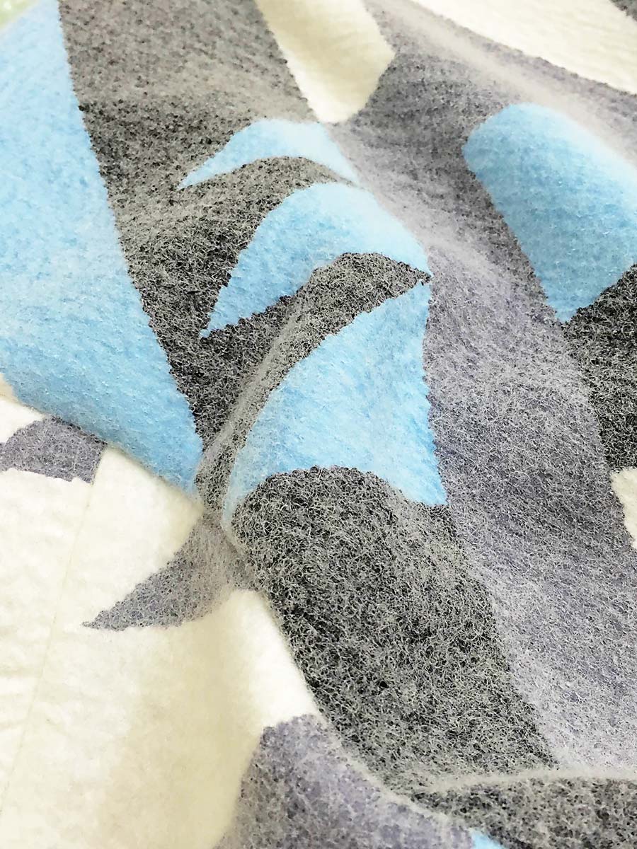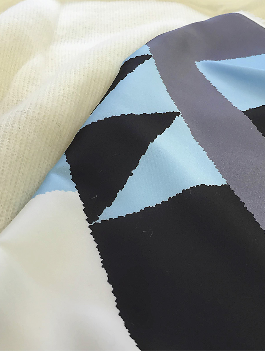 大きな幾何学柄をプリントしたサテンと、柔らかいスライバーニットをニードルパンチで結合したファブリック。