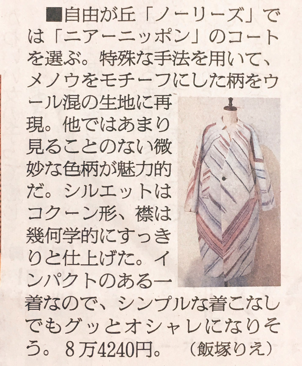 10/19の朝日新聞(夕刊)に メノウ石柄ニードル ロングコート 掲載頂きました。